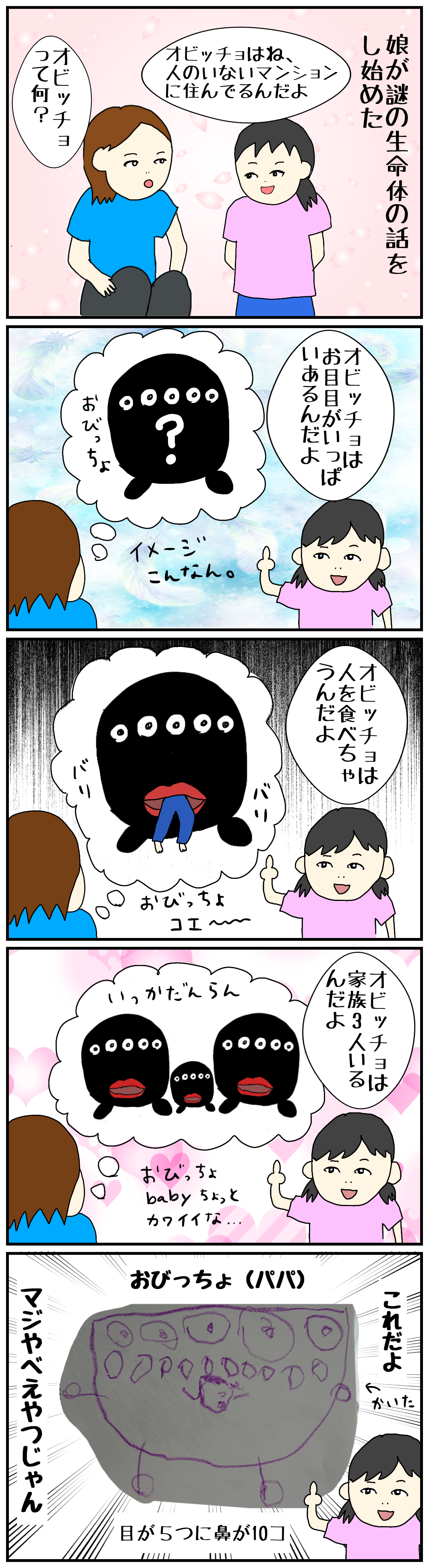 謎の生命体「おびっちょ」 2021年07月25日 11:30 しかも絵本とかに出てくるやつじゃなくて、娘しか知らないらしい。おびっちょって検索しても出てこないし、娘マジでやばいんじゃ…。 「こども」カテゴリの最新記事 タグ :#長女#育児漫画#育児絵日記 < 前の記事次の記事 > コメント コメントフォーム 名前 コメント 記事の評価 リセット リセット 顔 星 情報を記憶 コメントを投稿する