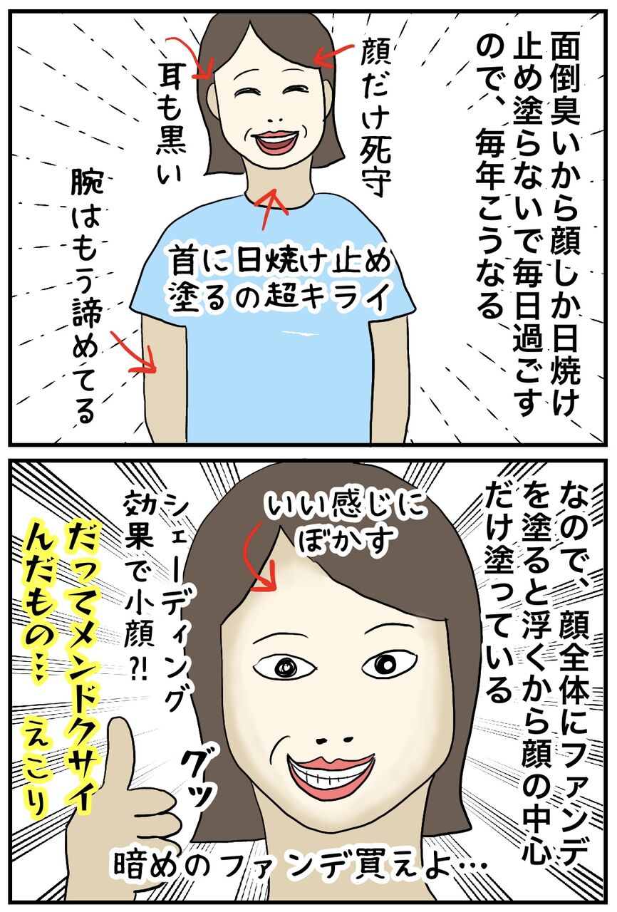 今の時期に毎年陥る現象 2024年08月29日 21:00 ブログネタ:【公式】「これって私だけ?」と思うこと に参加中! 夏の終わりのこの時期、毎年こうなるので能面期と呼んでいる。 顔は毎日日焼け止め塗ってるけど、首はベタつくし服に付くから嫌なんだよなあ… なので同じく顔だけ白く浮いてる人見るたび仲間意識を持っている。 「日常」カテゴリの最新記事 タグ :#日常 < 前の記事次の記事 > コメント コメントフォーム 名前 コメント 記事の評価 リセット リセット 顔 星 情報を記憶 コメントを投稿する
